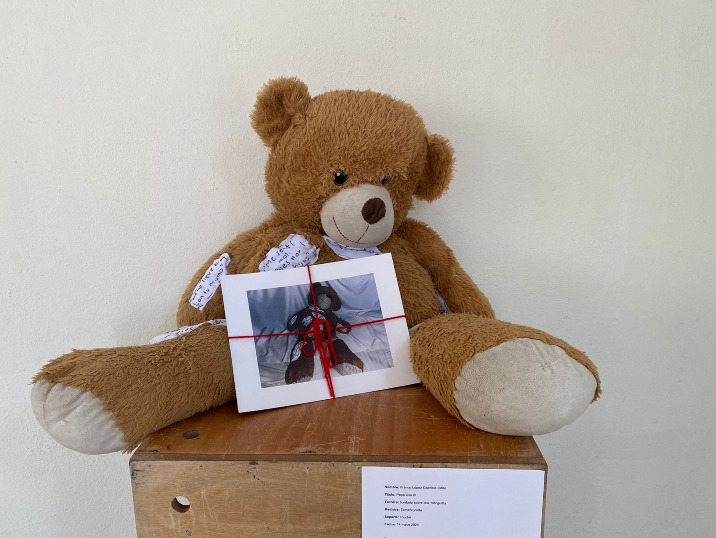 8 fotografías con medidas de tamaño carta, en las que se encuentra un oso de peluche de 1m aproximadamente, con parches de tela que ayudan a unir las partes que estaban rotas intencionalmente con anterioridad. En los parches un texto bordado sobre testimonios de mi papá, relacionados a la separación. El oso en un fondo blanco y mis dos manos indicando cómo voy reconstruyendo al oso. Detrás de cada fotografía los textos de cada parche. Todas las fotografías se mantienen juntas mediante un trozo de estambre rojo.